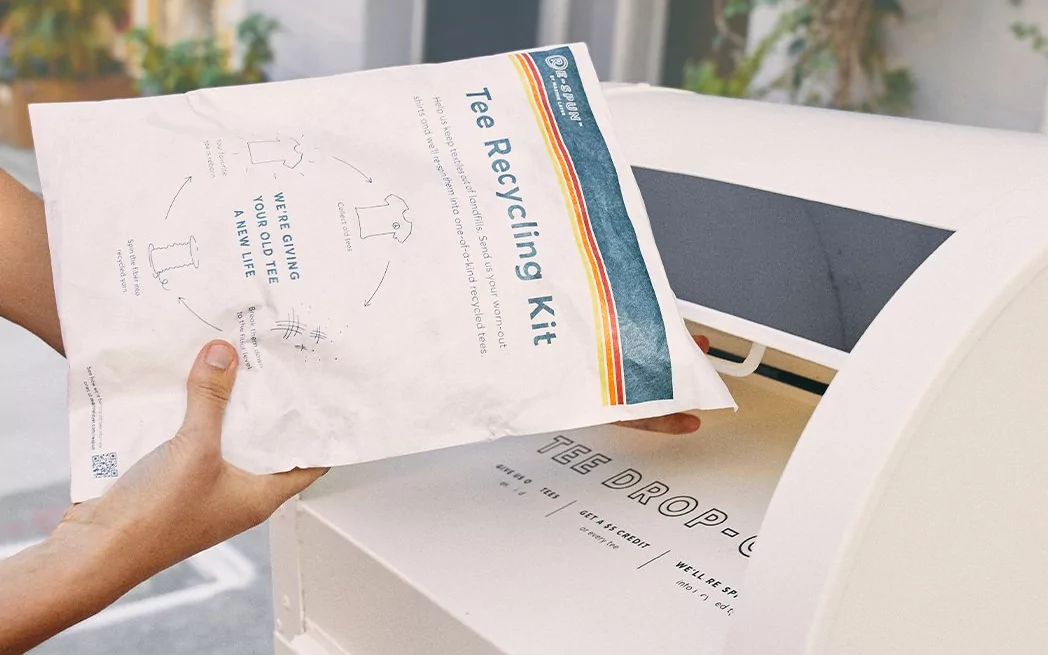 Marine Layer is an eco-conscious clothing company that offers a t-shirt recycling program called Re-Spun. Through the Re-Spun page on Marine Layers’ website, you can purchase a prepaid mailer, fill it with up to 15 pounds of your old tees, and receive a $40 credit per bag.
