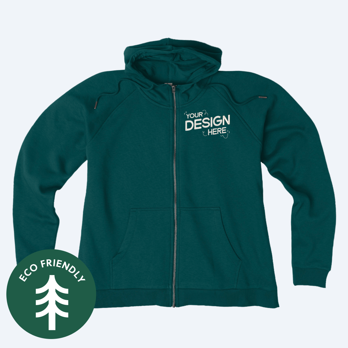 The Allmade Women's Organic CVC Zip-Up Hoodie is made from a sustainable blend of 65% organic cotton and 35% recycled polyester with a 100% cotton face for optimal printability and an ultra soft, cozy feel. It features a relaxed, women’s-fit silhouette designed to hit at the high hip, raglan sleeves, side seams, dyed-to-match drawcords with metal tips, front pouch pockets, 2x1 rib knit cuffs and hem, recycled twill neck tape, a jersey-lined hood, and a recycled tear-away label.