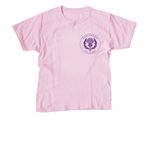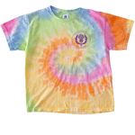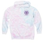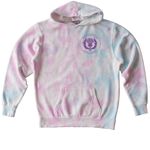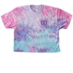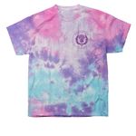 White, light pink, and tie-dye shirts with dark purple logos