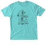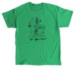 The sketch-like design depicts a cozy Gazan kitchen drawn with black outlines. Below the kitchen is the phrase "Let Gaza Live" which is bordered by a single olive tree branch to its right.