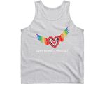 Red heart mosaic & rainbow wings, black, brown, and trans flag colors inside the heart.